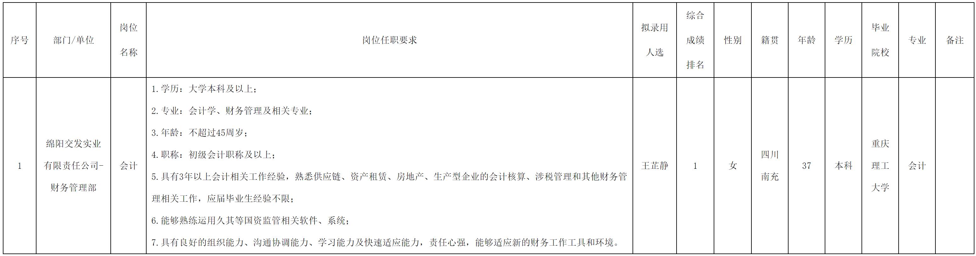 公示期为2026年2月10日至2026年2月12日。公示期间,如对结果有异议,可通过来访、来电向绵阳交发实业有限责任公司反映,反映情况要真实客观、实事求是,并署真实姓名、联系方式,便于调查核实。