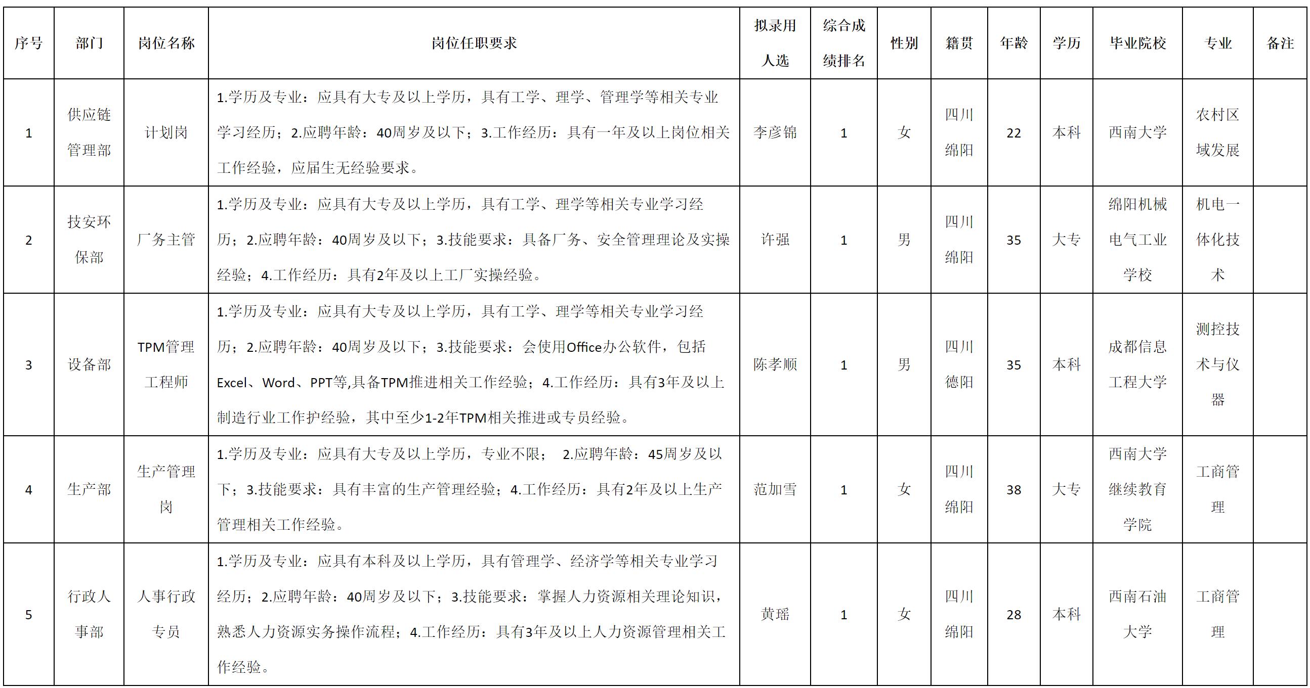 根据四川九华光子通信技术有限公司发布的招聘公告及招聘相关规定,经测试、考察、体检等程序,拟录用李彦锦等5名同志到四川九华光子通信技术有限公司工作,现予以公示,具体情况如下: