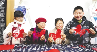 兰小奇(左二)创作的马年主题剪纸作品。 记者 李春梅 摄