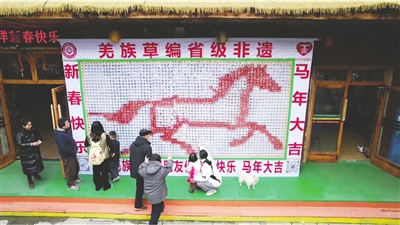 省级非物质文化遗产代表性传承人黄强说:“制作这幅‘骏马送祝福’文化墙,一方面是想用羌族草编非遗技艺迎接马年新春,为广大游客送上新年的美好祝福;另一方面也是想通过这样的创意作品,让更多的人了解、喜爱羌族草编,让非遗技艺在新时代更好地传承与发展。”
