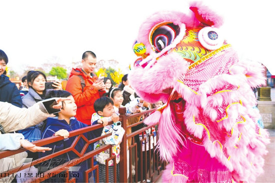在绵阳方特东方神画,舞狮表演吸引游客围观。记者 李春梅 摄