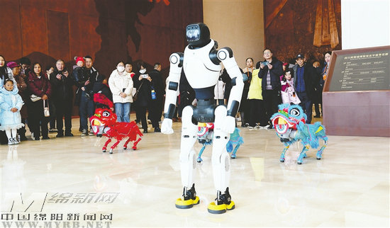 两弹城博物馆,智能机器人与身穿醒狮服的机器狗同台表演。记者 刘晓东 摄