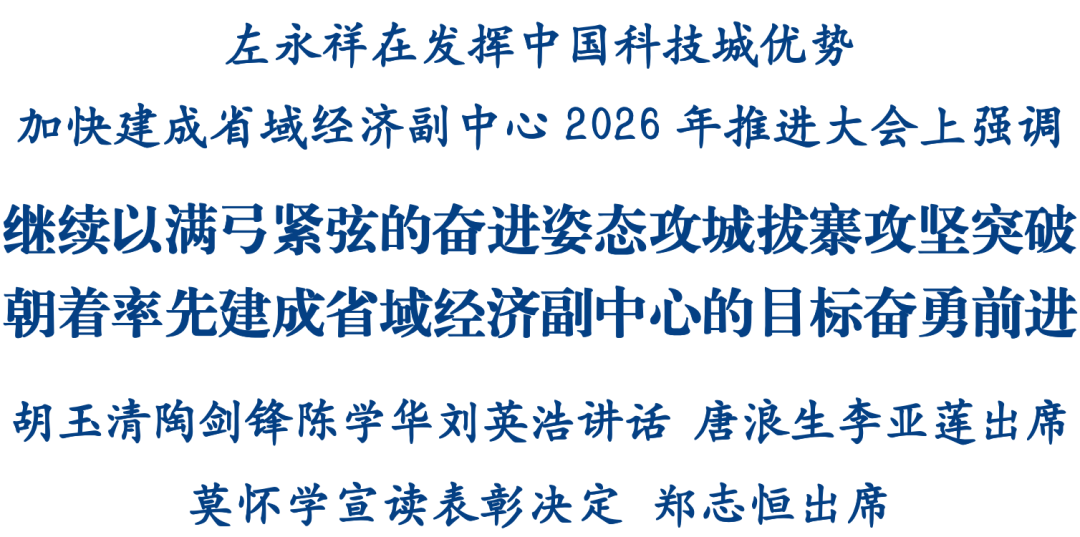 绵阳新闻网讯 2月24日,发挥中国科技城优势加快建成省域经济副中心2026年推进大会召开,省委常委、市委书记左永祥出席会议并讲话。他强调,要深入学习贯彻习近平总书记关于区域协调发展的重要论述和对四川对绵阳工作系列重要指示精神,认真落实党中央、国务院和省委、省政府部署要求,继续以满弓紧弦的奋进姿态攻城拔寨、攻坚突破,推动“十五五”良好开局,朝着率先建成省域经济副中心的目标奋勇前进,奋力谱写中国式现代化绵阳新篇章。