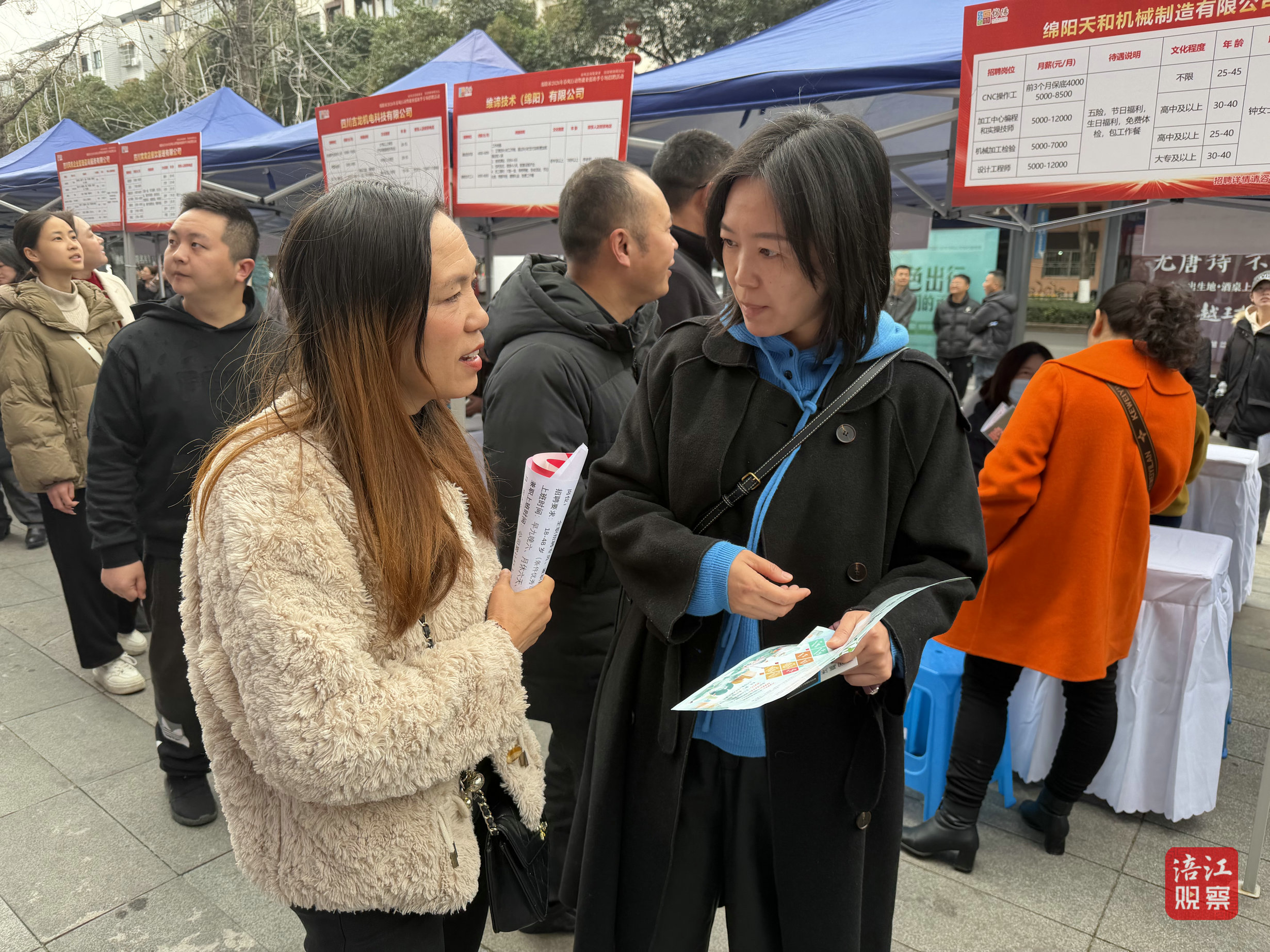 企业招聘代表或端坐桌前细致解答求职者疑问,或拿着宣传单向过往群众主动推介岗位。求职人群穿梭于各个展位之间,认真查看招聘简章、咨询岗位详情,薪资待遇、通勤路程、福利待遇成为现场咨询的高频问题。