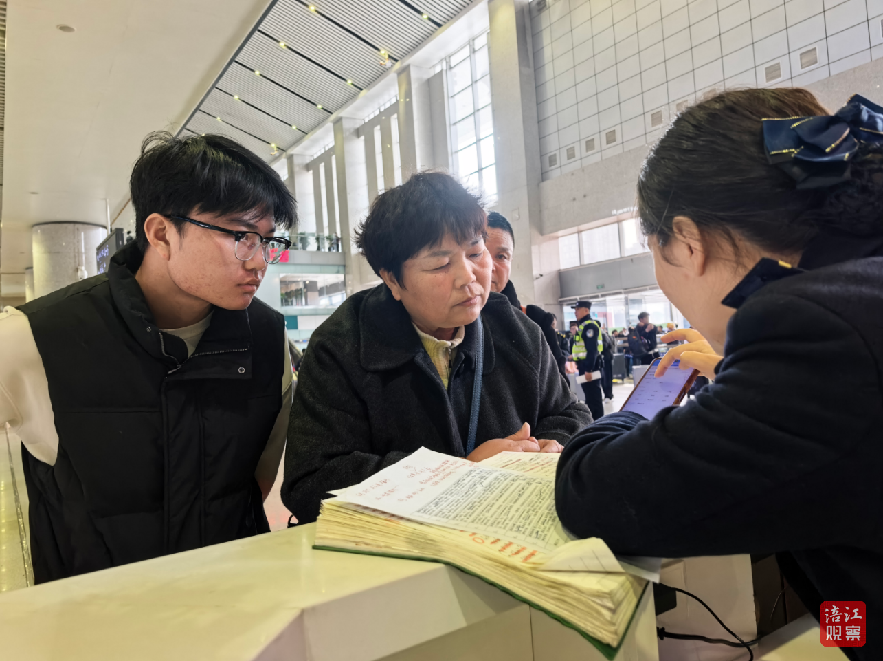 8点20分,进站口传来新的消息:一名视力障碍旅客携带多件行李准备进站。接到通知的李璐君再次快步飞奔至进站口,全程搀扶引导,协助对方顺利进入候车厅、完成检票,直至平安送上列车。