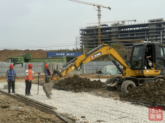 记者在现场看见,数十名施工人员佩戴好安全帽忙碌在各个角落,挖掘机、渣土车等工程车辆往来穿梭,主体施工区域的作业面全面铺开,一派繁忙景象。