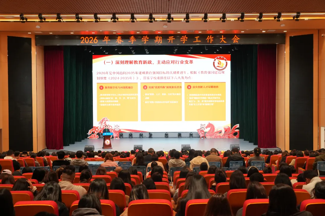 开学工作大会 绵阳富乐学校在2026年春季学期开学工作大会上,该校党委书记梁春艳以“骐骥驰骋,驭新致远”为主题作开学工作报告,明确本年度以“贯通?融合?赋能”为核心,深化十五年一贯制育人实践。