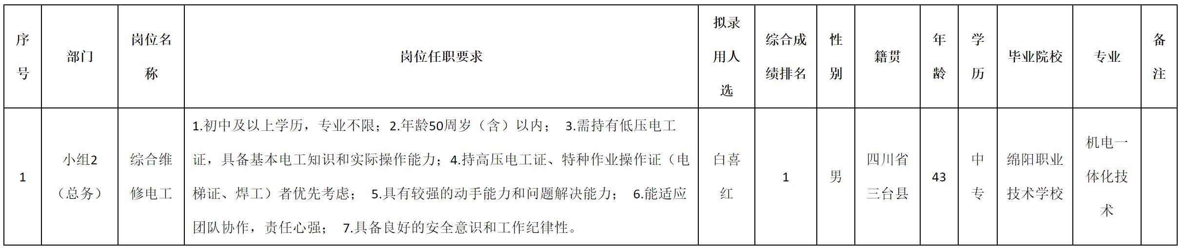根据四川安和精密电子电器股份有限公司发布的招聘公告及招聘相关规定,经测试、考察、体检等程序,拟录用白喜红同志到四川安和精密电子电器股份有限公司工作,现予以公示,具体情况如下: