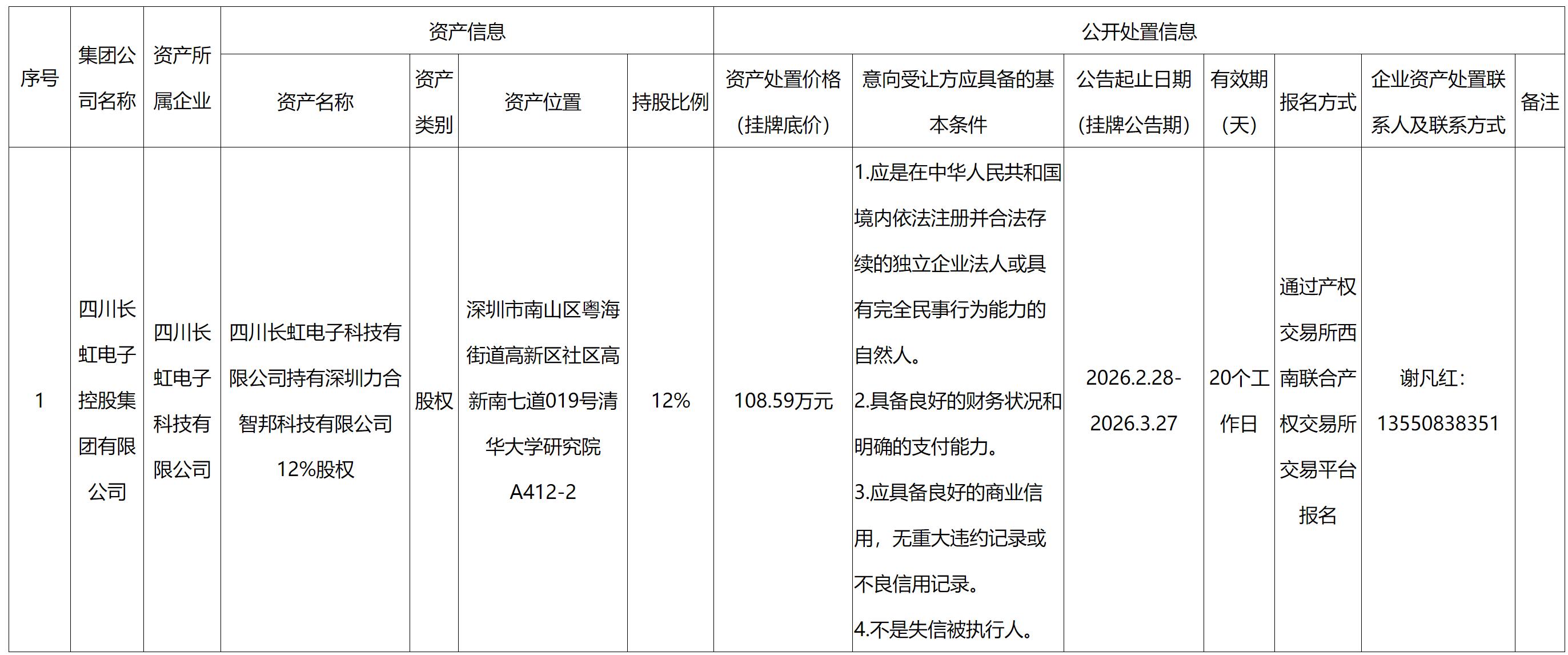 四川长虹电子科技有限公司资产处置公告
