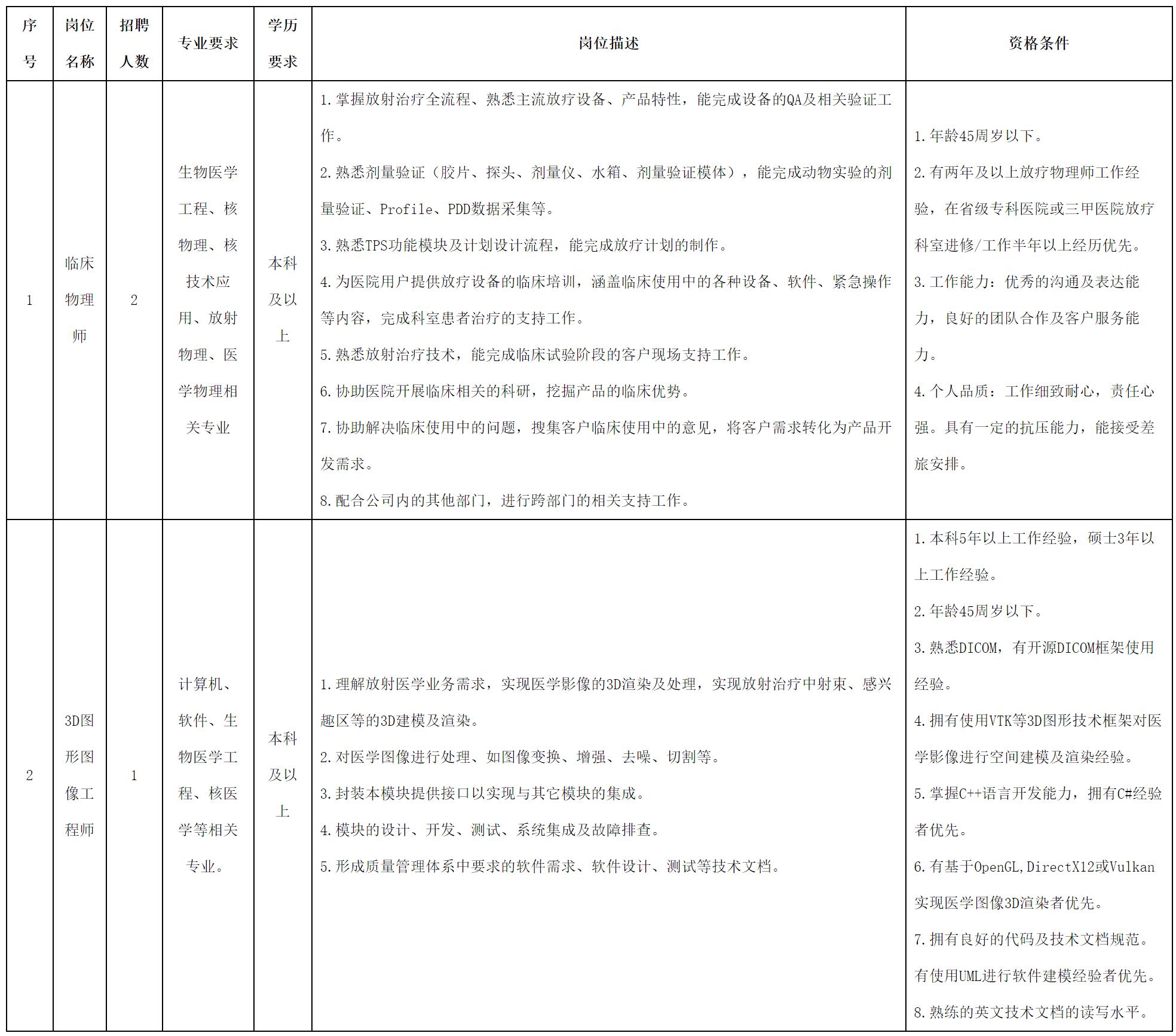 现因公司经营发展需要,现面向社会诚聘临床物理师、3D图形图像工程师岗位人员,具体岗位招聘信息公告如下: