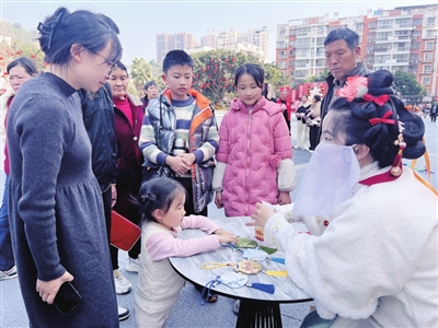“非遗闹春·福到盐亭”新年系列文化活动现场,香囊制作互动体验点排起长队。