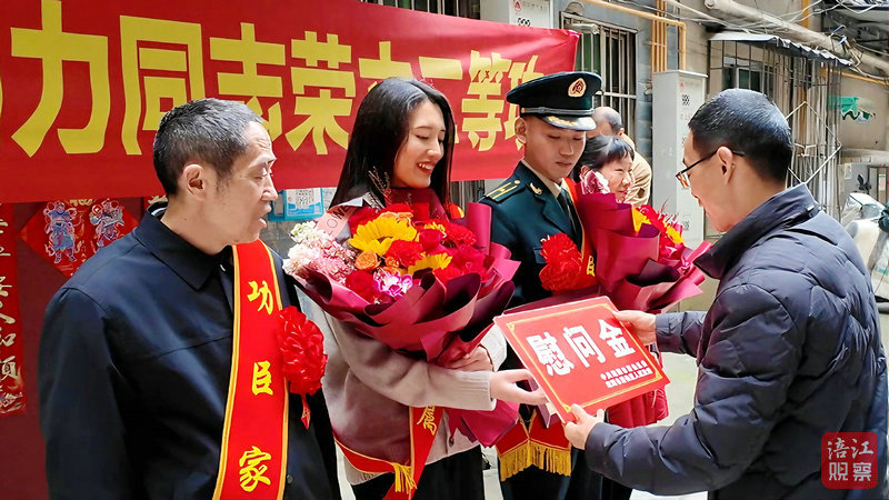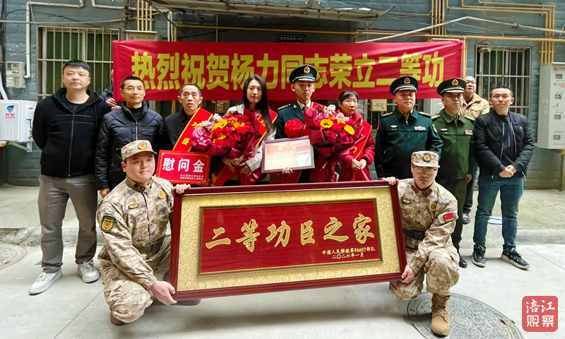 现场,送喜报队伍敲锣打鼓、高举横幅,前往游仙区沈家坝北街,将“二等功臣之家”牌匾送到立功受奖军人杨力家中。军地领导为其家属披绶带、戴红花,在郑重宣读立功受奖喜报后,送上奖励金、慰问品和鲜花,邻里乡亲共同见证了这一光荣时刻。