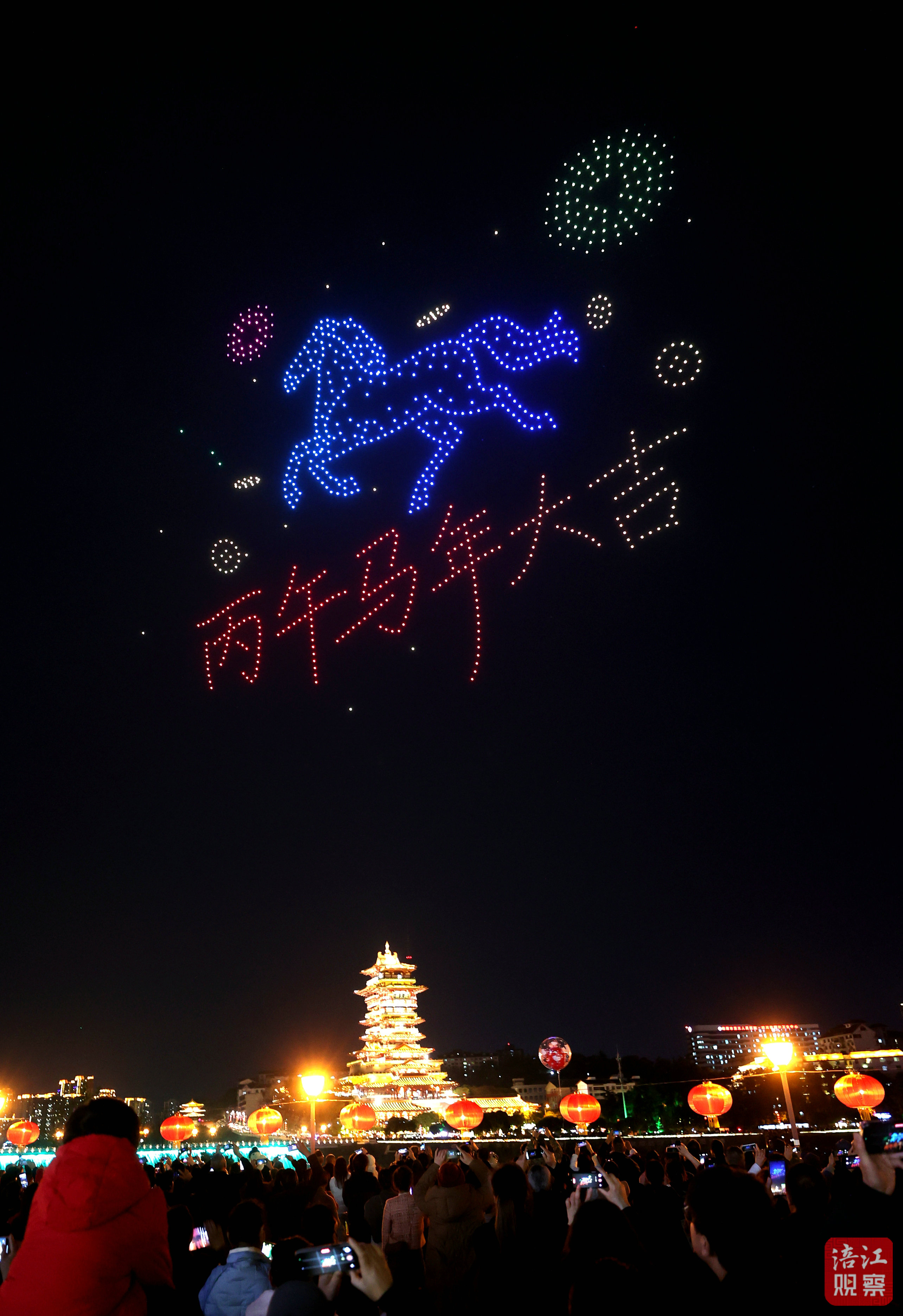 表演伊始,一匹奔腾的骏马身姿矫健、栩栩如生,呼应着“丙午马年大吉”的文字展现,寓意着绵阳新一年驰骋奋进、笃行致远;紧接着,“年年有余”“幸福安康”“马年大吉”等新春元素次第绽放,将诚挚的美好期许传递给在场每一位观众,现场欢呼声、喝彩声此起彼伏,新春氛围感拉满至极致;“相约绵阳、筑梦川超”的特别展示,则以科技之光点燃足球激情,展现绵阳文旅和体育相结合的独特浪漫,助力“川超”赛事。