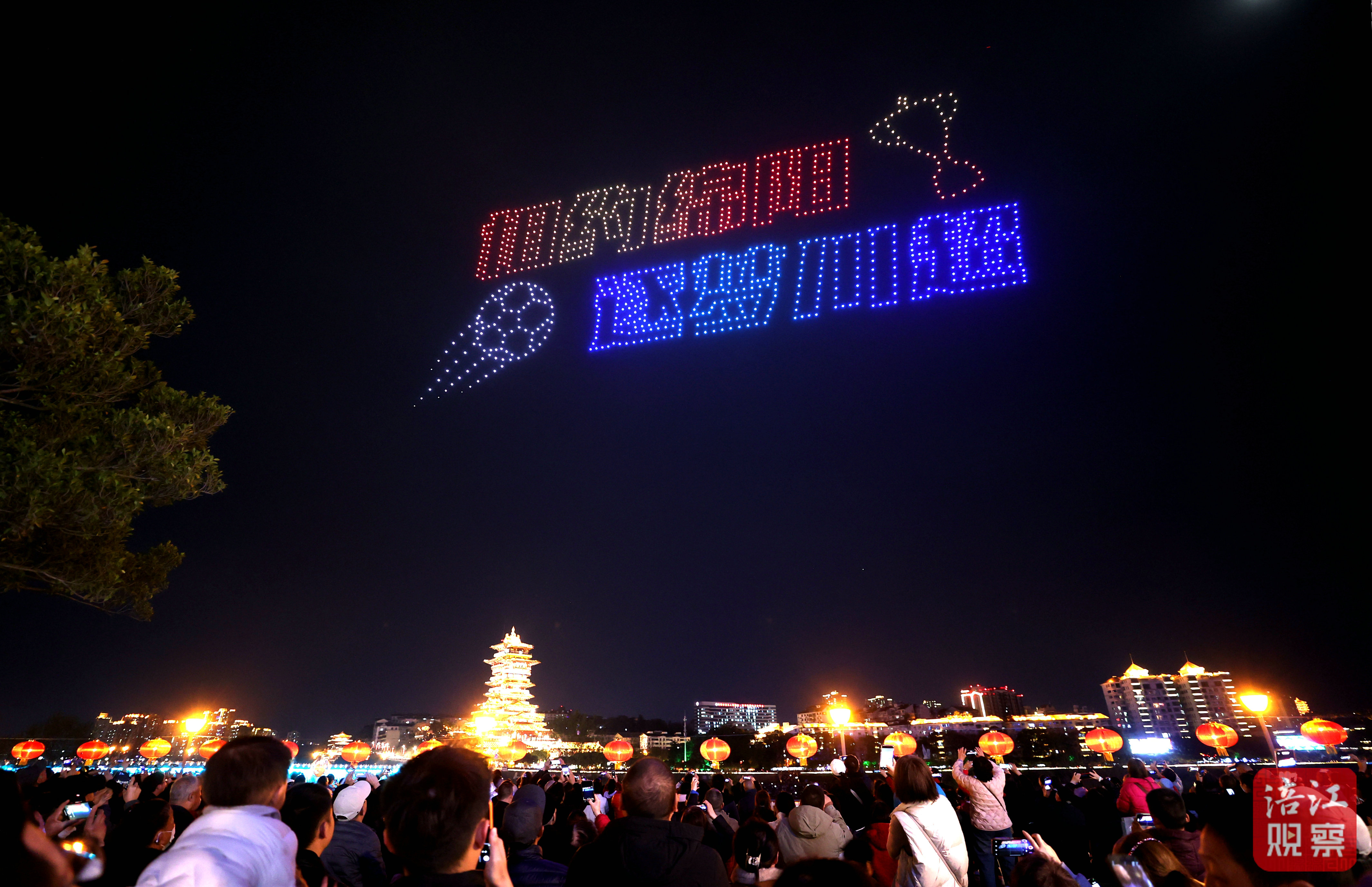 光影流转间,西山子云亭、富乐山、罗浮山温泉、李白故里、三台古城楼等绵阳各区市县的地标建筑依次登场,细腻光影勾勒出建筑之美,诉说着绵阳独具特色的文旅资源,饱含对城市的热爱以及对各地游客的诚挚邀约。临近尾声,无人机再次不停变幻闪烁,最终定格的“恭祝元宵快乐”的字样在夜空中交汇成一条流动的星河,与涪江两岸的万家灯火遥相呼应,为观众送上最浪漫的团圆祝福。