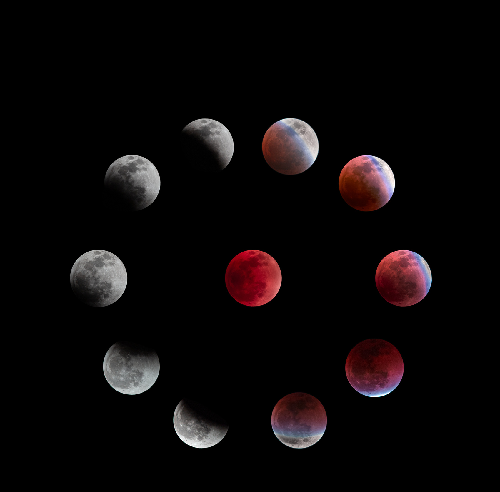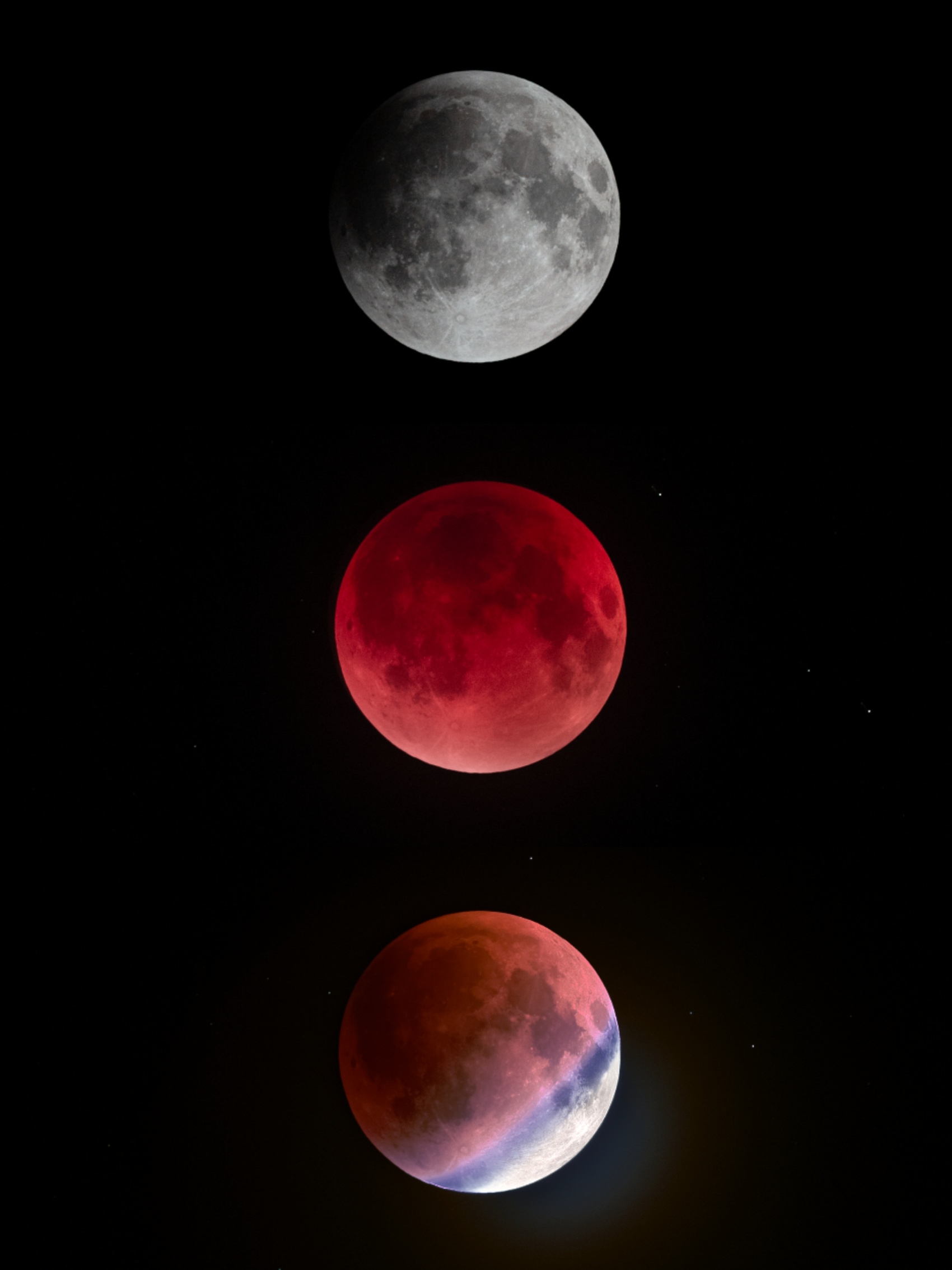 食既之后,进入食甚阶段,这时红月亮达到最暗时刻,星空背景更加清晰;最后进入生光到复圆阶段,月球逐渐移出本影,恢复满月银辉。