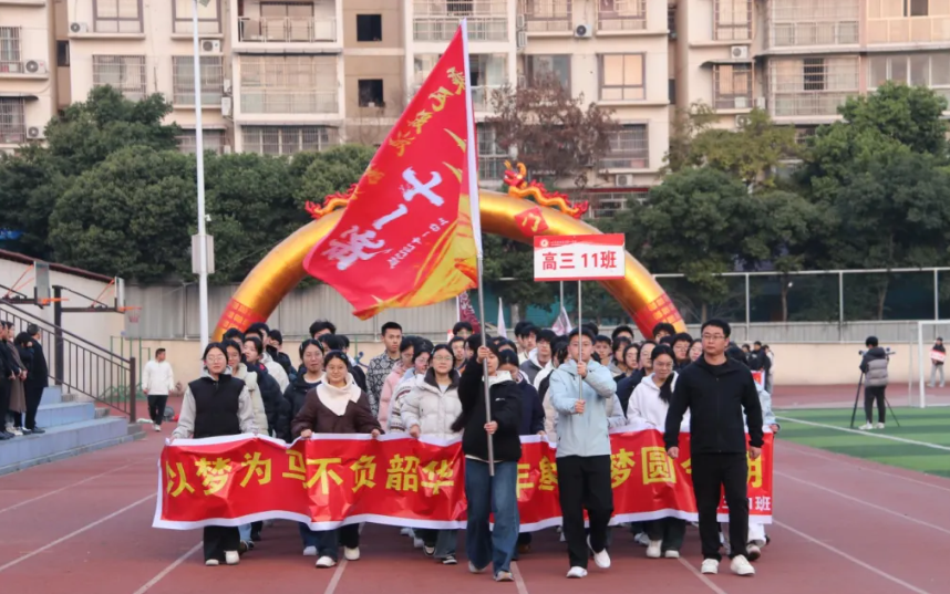 仪式在庄严的升国旗、奏唱国歌中拉开帷幕,鲜艳的五星红旗冉冉升起,点燃了全体师生的拼搏热情。随后,全体师生齐唱校歌、共诵“智、仁、勇、新”校训,熟悉的旋律与铿锵的校训,凝聚起同心奋进、聚力攻坚的强大力量。高三各班依次入场,以精炼的班级介绍展现班级风采,尽显少年意气与追梦决心。