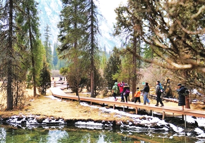 在大熊猫国家公园王朗片区,银装素裹的原始林海吸引大量游客前来徒步、研学;今年新启用的虎牙滑雪场,依托2400米海拔打造“云端滑雪”体验,藏族同胞的锅庄舞与冰雪运动交织出别样年味。素有“深山故宫”美誉的报恩寺则推出“古建新玩法”,沉浸式导览、国潮市集、民族歌舞展演等活动让游客流连忘返。