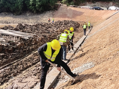 鹅溪镇长寿村山坪塘整治现场,工人们正在砌筑护坡。 叶亮亮 摄