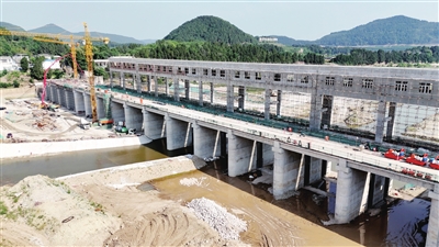 兴水利,更要除水患。记者走进梓江盐亭县麻秧拱改闸及两河拱闸除险加固工程施工现场,巨型塔吊凌空挥舞,运输车辆往来穿梭,闸坝雏形已初步显现。而在另一边的梓江盐亭巨龙引调水项目工地,施工人员正抓紧进行墩顶交通桥和检修平台结构施工作业。