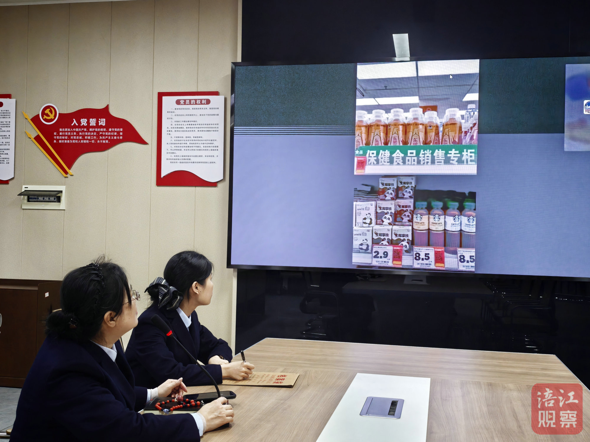 工作人员正通过视频连线,与申请办理业务的零食有鸣批发超市梓潼县水岸花都店店长董婉平实时对话。在工作人员的指导下,董婉平手持手机,将店内散装食品区、保健食品销售区、冷藏设备等关键点位一一清晰地展示在镜头前。全程录音录像,规范有序。