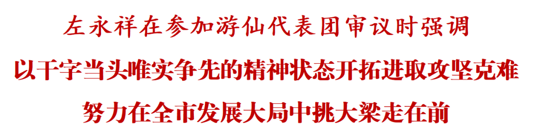 绵阳新闻网讯 3月7日,省委常委、市委书记左永祥参加游仙代表团会议,与代表们一起审议政府工作报告、审查“十五五”规划纲要草案等。他强调,要深入学习贯彻习近平总书记对四川对绵阳工作系列重要指示精神,全面落实党中央大政方针和省委、市委部署要求,牢牢把握高质量发展这个首要任务,以干字当头、唯实争先的精神状态开拓进取、攻坚克难,努力在全市发展大局中挑大梁、走在前。