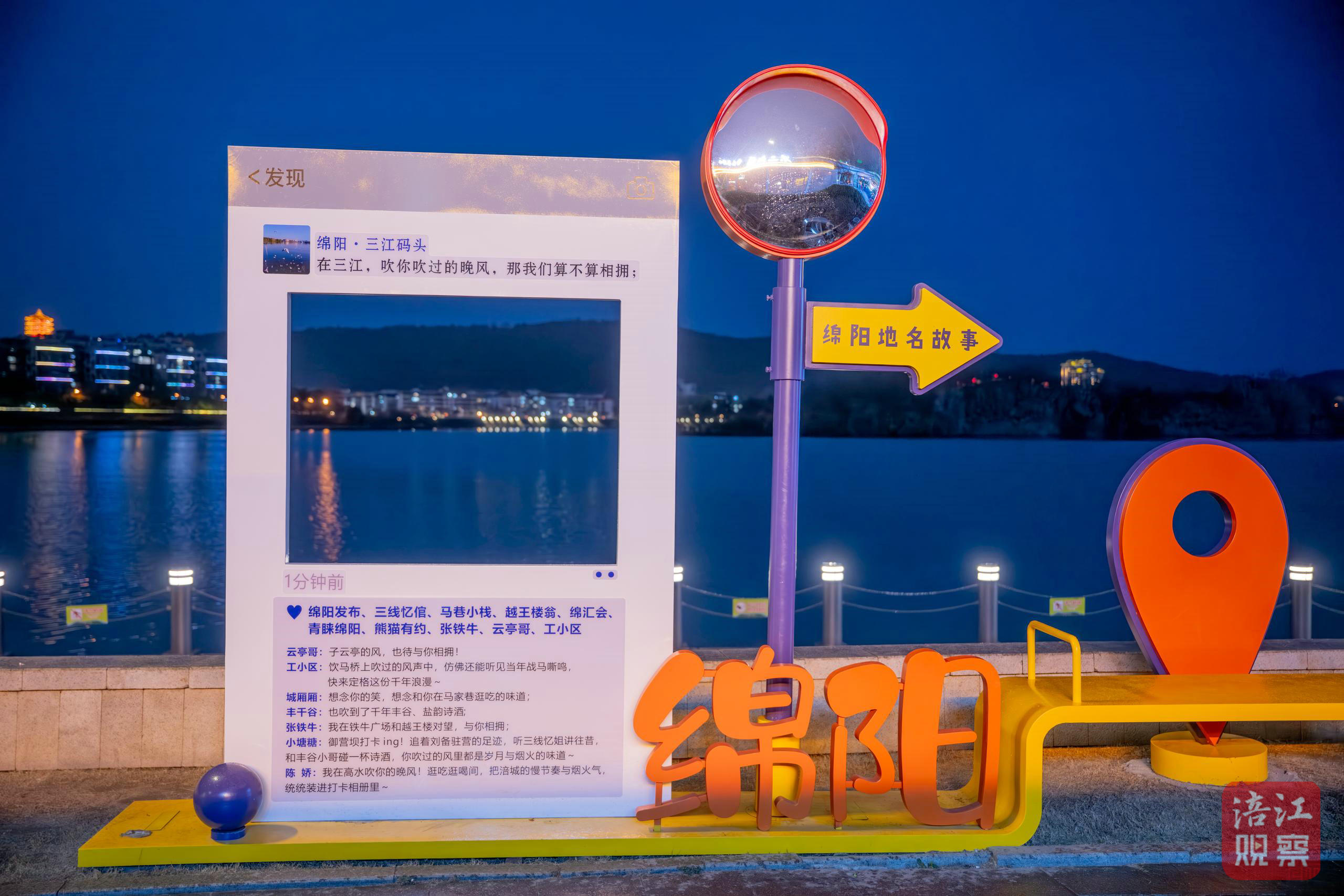 2025年,涪城区将地名文化引入“越王楼-三江湖”4A级景区。三江码头全新亮相的字幕城市画框打卡点,循环展示核心地名介绍;特色彩绘墙与打卡装置,让地名故事化作江畔风景。