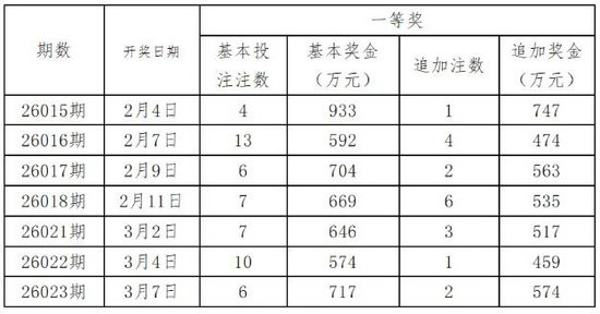 从实际开奖结果也可以看出:第26015期中出4注一等奖,基本投注单注奖金为933万余元,其中1注追加投注,多得奖金747万元;第26016期4注追加一等奖,单注奖金多得474万元;第26017期2注追加一等奖,单注奖金多得563万元。