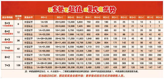 答:新规则下,大乐透套餐票和复式票的参与体验进一步提升。尤其是当奖池超过8亿元,三至七等奖奖金上浮时,采用复式或套餐投注的购彩者一旦中奖,很可能同时命中多个奖项,形成“奖金叠加”效应,中奖惊喜加倍!