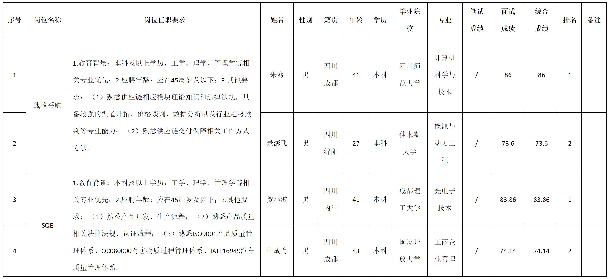 根据四川九州电子科技股份有限公司发布的招聘公告及招聘相关规定,现将测试成绩予以公示。