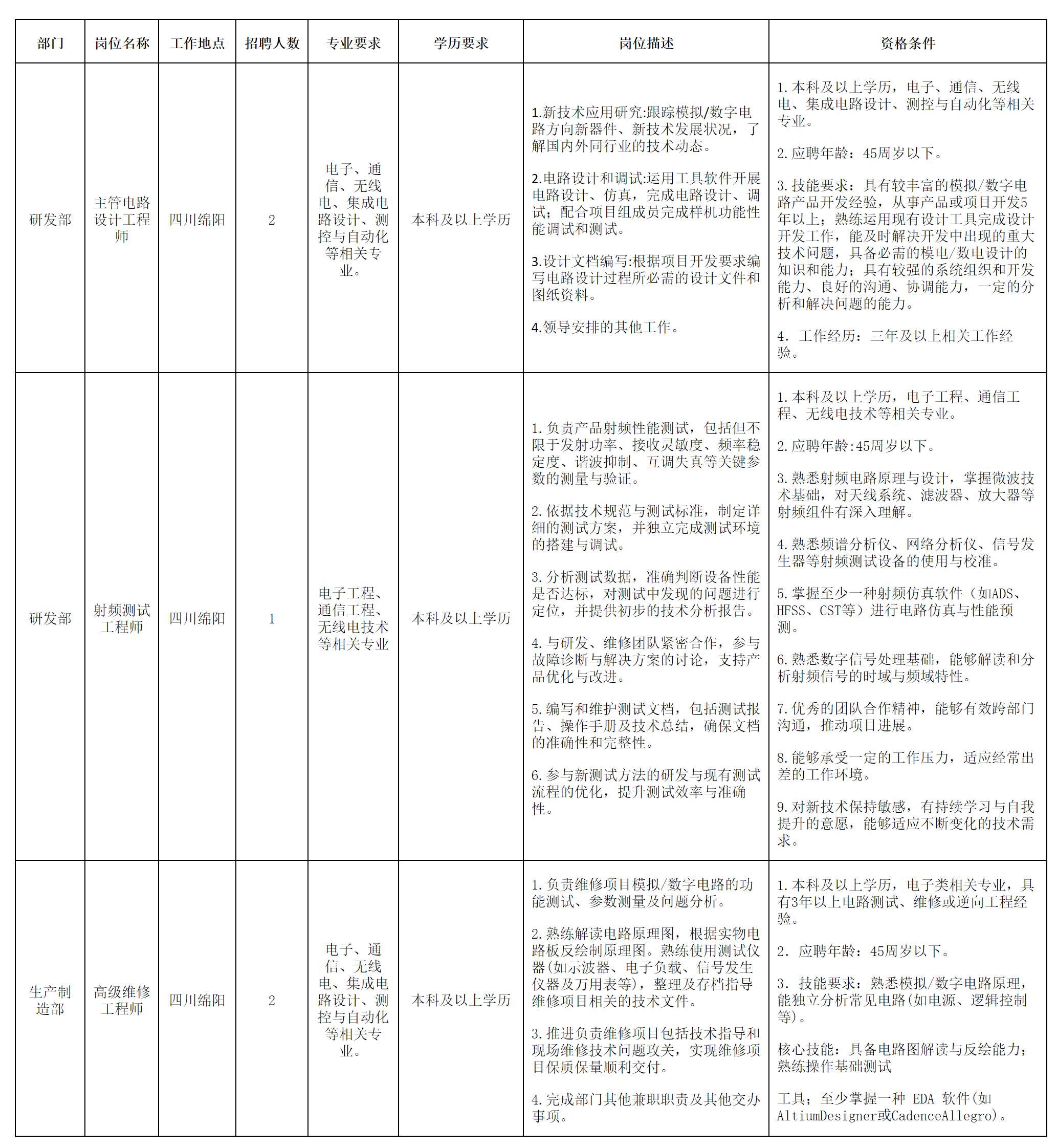 四川长虹电子科技有限公司(国营第七八〇厂)始建于1958年,是国家“一五”期间的156个重点项目之一,是我国第一个机载火控雷达科研生产基地,位于绵阳市经济技术开发区。公司注册资本1.7亿元人民币,为国有独资企业。公司以高端光电仪器和高端光电装备为主线,主要从事重力测量、光电探测和光电告警领域产品研发和生产。因业务发展需要,现诚聘英才,招聘岗位及要求如下: