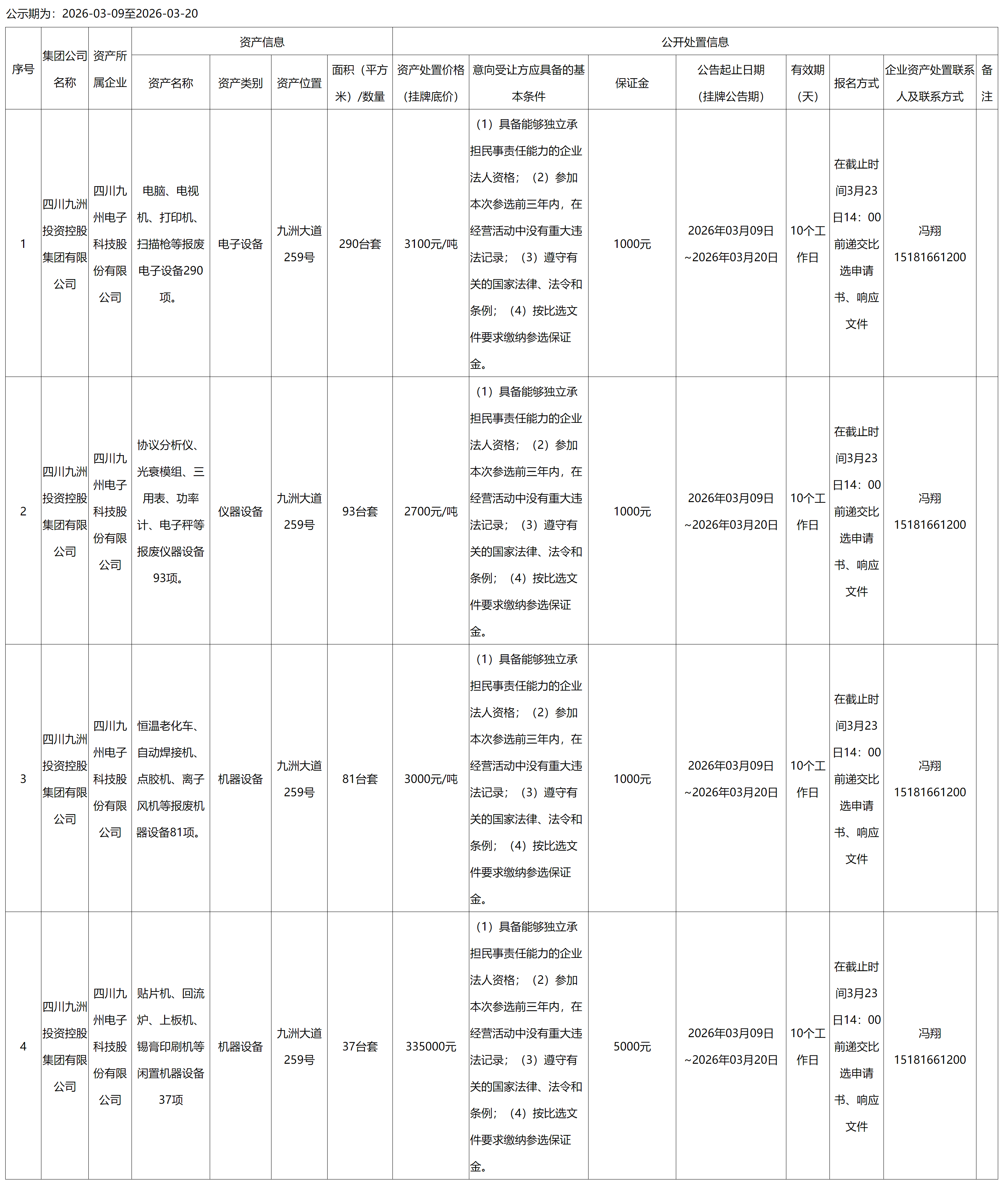 四川九州电子科技股份有限公司废旧仪器设备处置公告