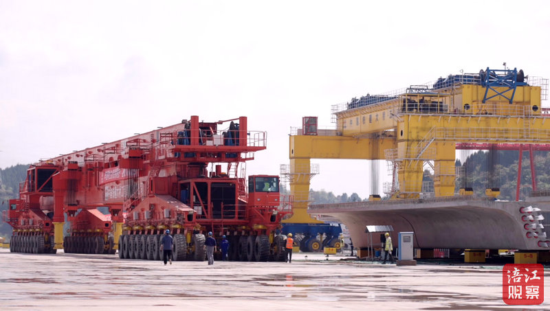 架设现场,随着指挥人员一声令下,运架一体机缓缓启动,将一榀长32.6米、宽12.2米、重达715吨的箱梁平稳吊起,精准调整位置、校准标高,历经起吊、推送、横移、落梁等一系列规范操作后,箱梁稳稳落在陶家湾大桥0-1号墩的垫石上。首榀箱梁的顺利架设,为后续大规模、连续性架梁作业奠定基础。