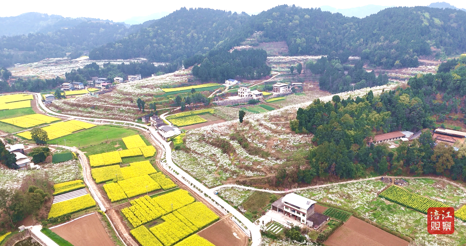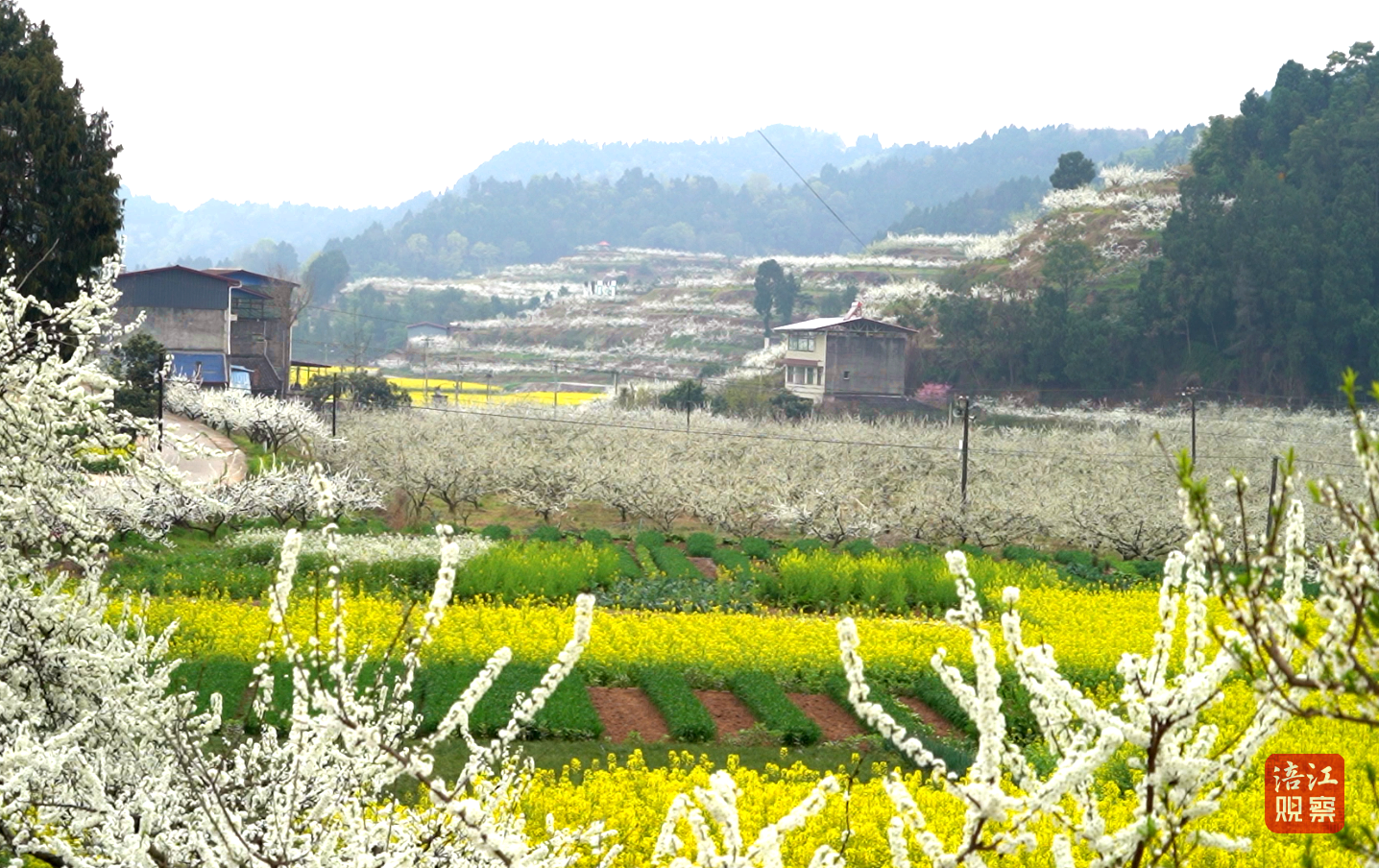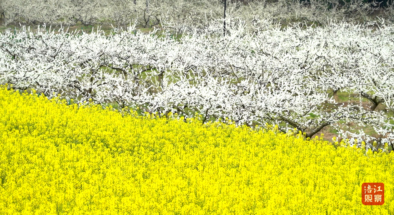 金黄油菜花穿插其间,与李花交相辉映,勾勒出“半坡白雪半坡金”的田园画卷。
