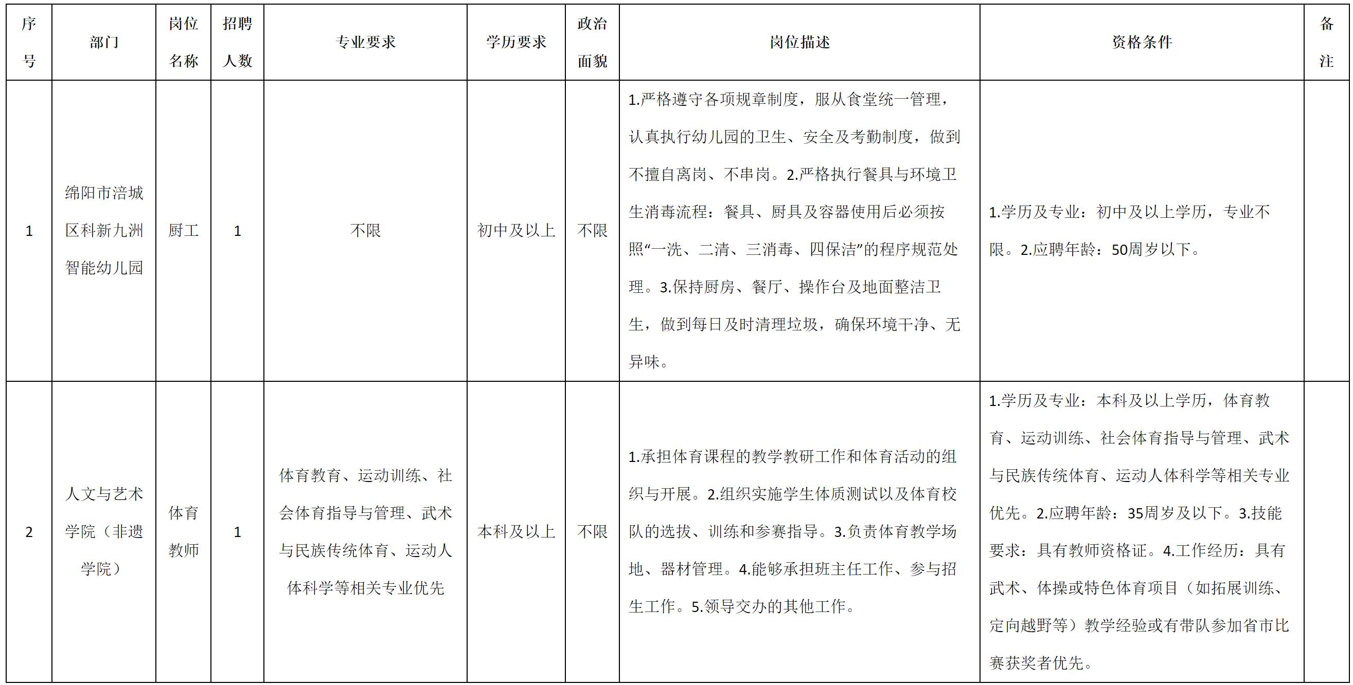 四川九洲教育投资管理有限公司关于招聘厨工等岗位的公告