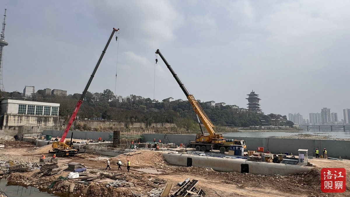 施工现场,原橡胶坝已完成破除作业,取而代之的是横卧江面的崭新钢坝雏形。工人们正分布在多个作业面加紧安装钢闸坝设备,一旁的技术人员则反复校对数据,精准定位钢坝轴线,确保每一道工序都达到设计标准。