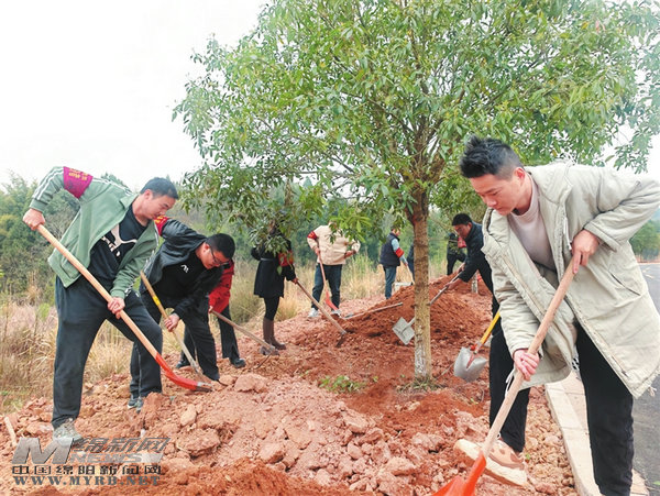 在梓潼文昌公园二期,干部群众分工协作,精心栽植红枫、杨梅、樱花等特色树种800余株。