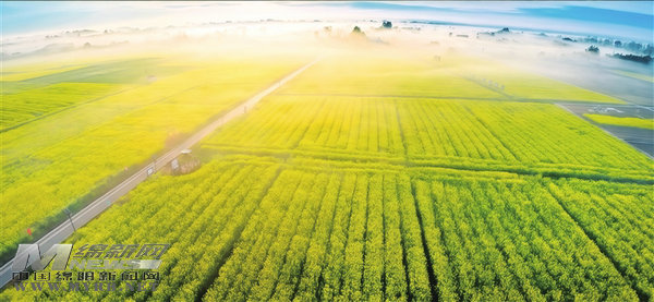 晨光薄雾中,安州区现代农业粮油园区的万亩油菜花海铺展成一幅流动的油画。记者 安峥 摄