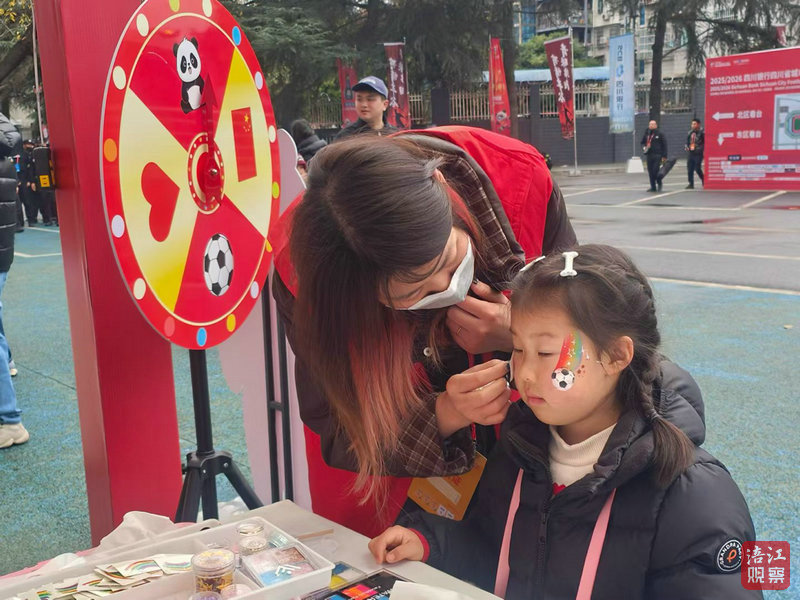 最热闹的当属彩妆技能体验区。来自游仙顺风职业培训学校的专业老师刚摆好工具,转盘前就排起了长队。足球、熊猫、国旗、爱心,四种样式的彩绘图案随着转盘旋转,为球迷们带来一份份惊喜。5岁的康卓翊小朋友在家人的陪伴下,转动转盘选中了“国旗”图案。当老师将鲜艳的国旗彩绘贴在他的小脸上时,他笑得格外开心。“我们一家人都来看球,支持绵阳队!”康卓翊说。