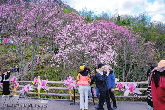 在桂溪镇九皇山、药王谷景区,漫山辛夷褪去寒意、蓄力绽放,粉的、白的、红的、紫的花朵缀满枝头,如烟似霞、美不胜收。山间清风裹挟着花苞的清甜,游客们伴着羌家姑娘的舞步共跳沙朗,欢声笑语间,羌山春日的氛围感拉满。