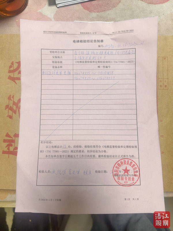 直播中,涪城区虹色嘉苑小区的居民反映,小区电梯内的使用标志有效期截至2026年1月,但直至3月,标志仍未更新,物业也仅出示了一份临时的电梯检验结论告知单,这让每天“上上下下”的居民心里直打鼓。“电梯是否进行了检验?乘坐还安全吗?”