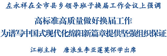 左永祥在讲话中指出,市县乡是国家治理体系的重要组成部分,在坚持和加强党的全面领导、贯彻落实党中央决策部署中发挥着承上启下的重要作用。“十五五”时期是基本实现社会主义现代化夯实基础、全面发力的关键时期,也是绵阳加快建设中国特色社会主义科技创新先行区、加快打造国家战略腹地重要承载地、加快建成省域经济副中心的重要时期。这次换届选出的领导班子,任期与“十五五”时期高度重合,肩负着推动实现“十五五”目标任务、奋力开创绵阳高质量发展新局面的重要使命。全市上下要站在政治和全局的高度深刻认识做好这次换届工作的重大意义,坚定拥护“两个确立”、坚决做到“两个维护”,进一步提高政治站位,确保换届工作始终沿着正确方向前进。
