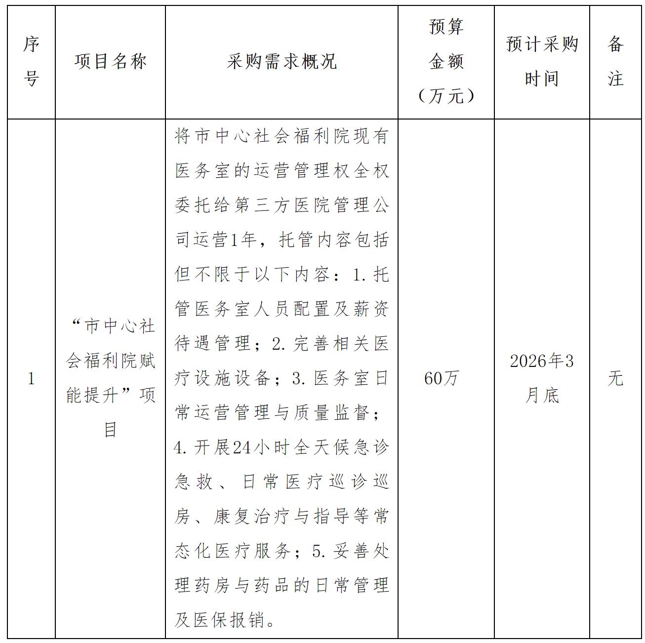 为便于供应商及时了解政府采购信息,根据《财政部关于开展政府采购意向公开工作的通知》(财库〔2020〕10号)等有关规定,现将绵阳市民政局2026年度政府采购意向公告(第4批)采购意向公开如下: 次公开的采购意向是本单位政府采购工作的初步安排,具体采购项目情况以相关采购公告和采购文件为准。 绵阳市民政局 2026年03月10日