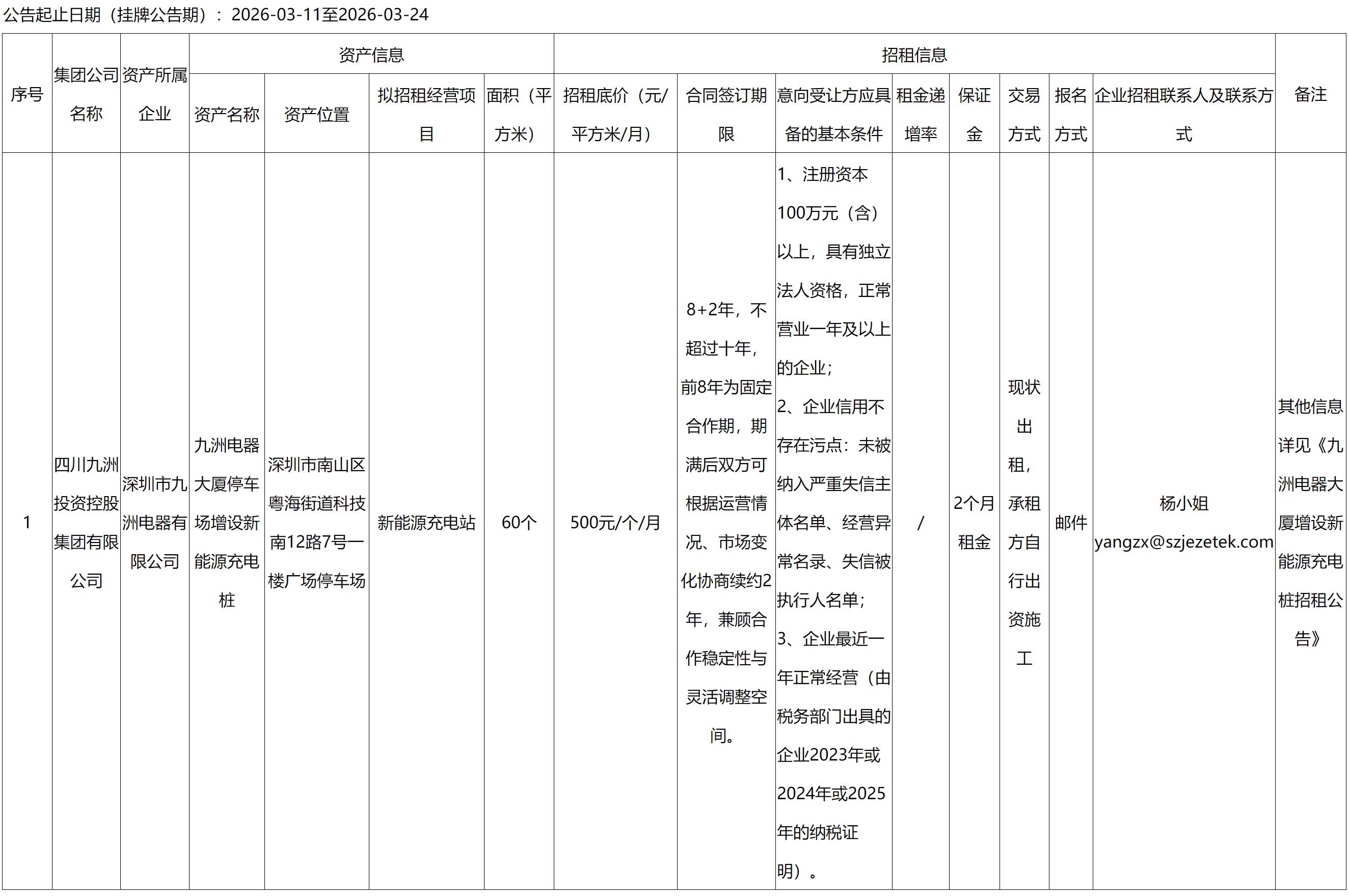深圳市九洲光电子有限公司资产九洲电器大厦停车场增设新能源充电桩公开招租公告