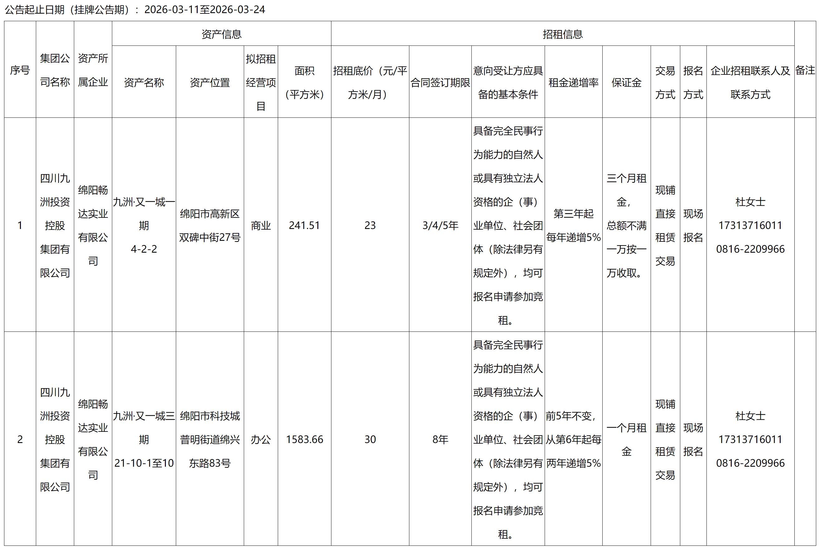 四川九洲千城商业管理有限公司高新项目部九洲·又一城部分资产出租公告
