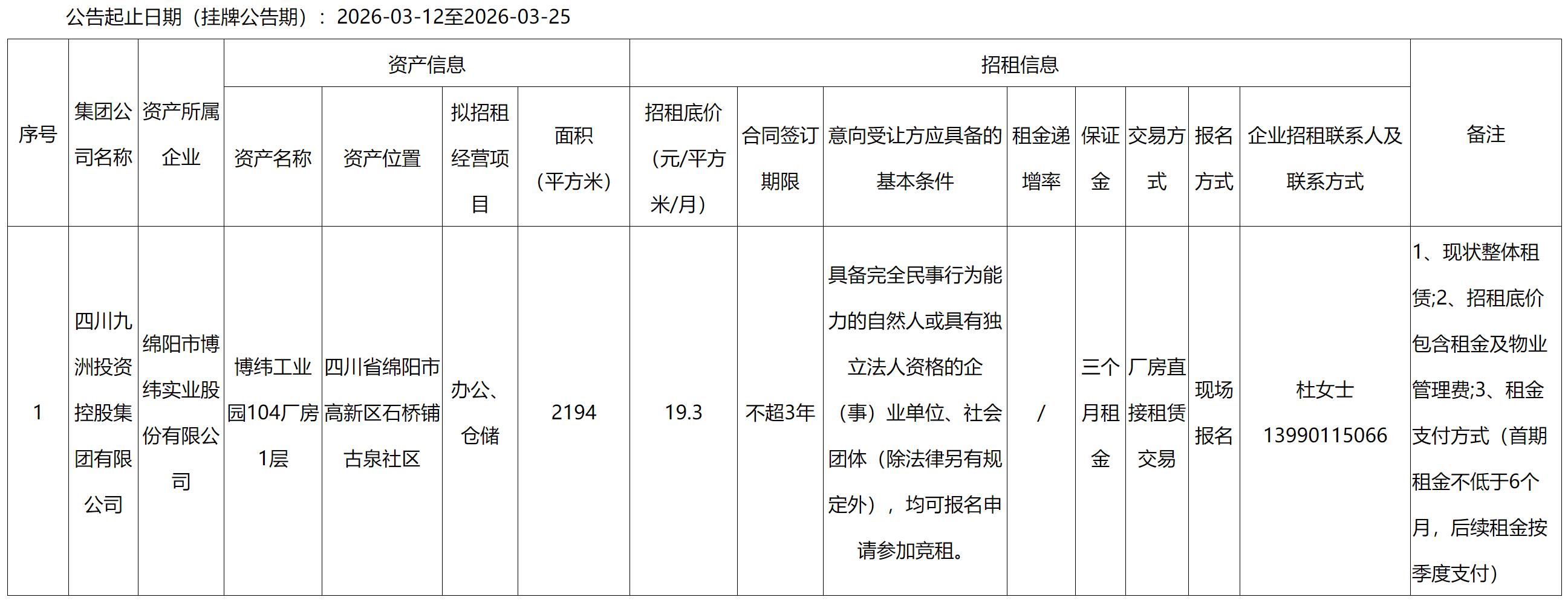四川九洲千城商业管理有限公司园区项目部博纬工业园厂房出租公告
