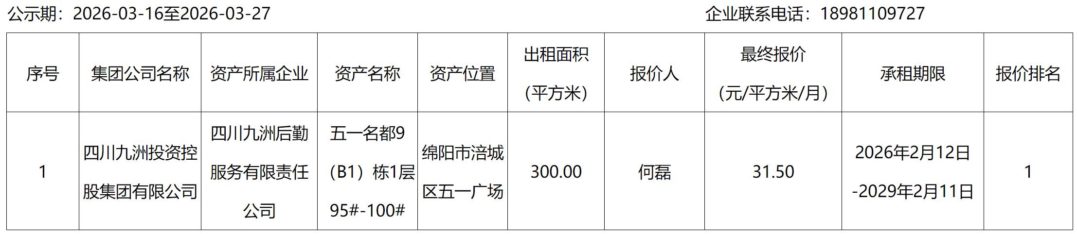 四川九洲后勤服务有限责任公司资产出租结果公示