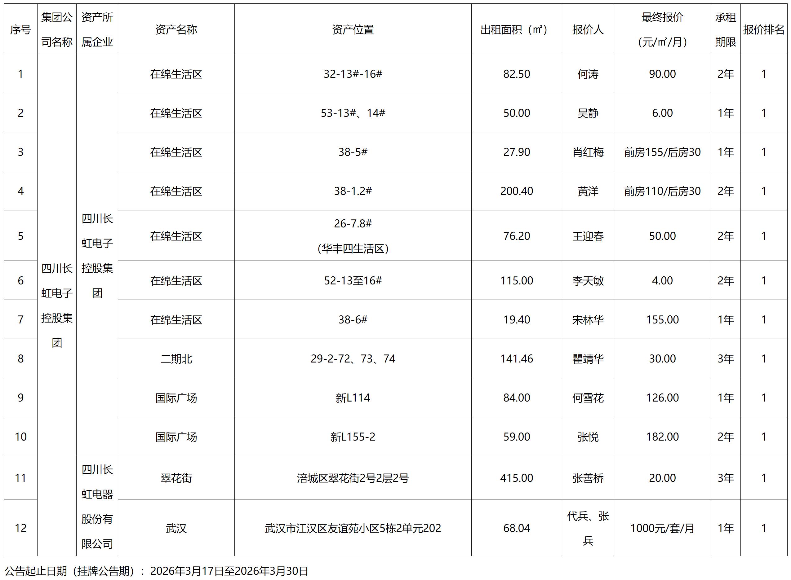 四川长虹电子控股集团有限公司资产出租结果公示