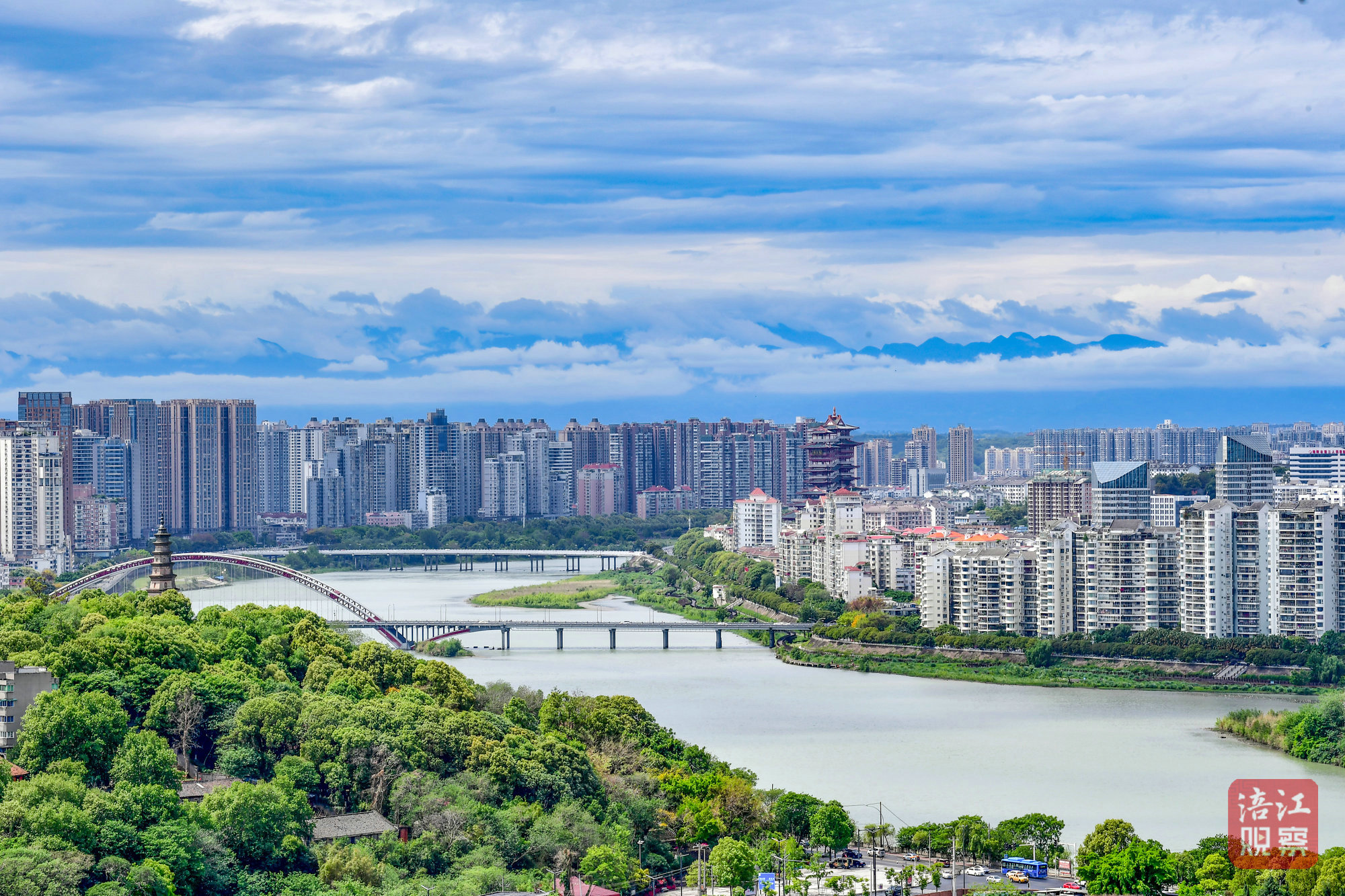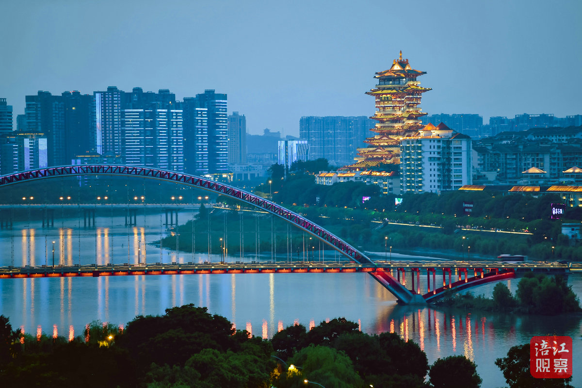 第二天,汪仲洋抵达绵州城。重建后的绵州,青山环抱,市井繁庶。他骑马立于绵州渡口,远望秋云红霞,越王楼高耸在芙蓉溪畔,一时诗兴大发,作《抵绵州》: