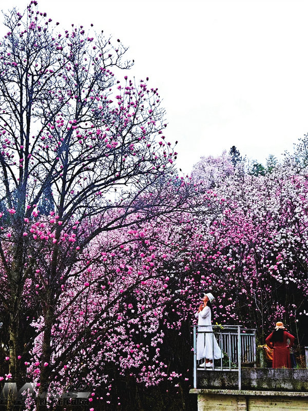 江油戴天山辛夷花盛开,游客在花树下欣赏美景。 记者 陈元松 摄
