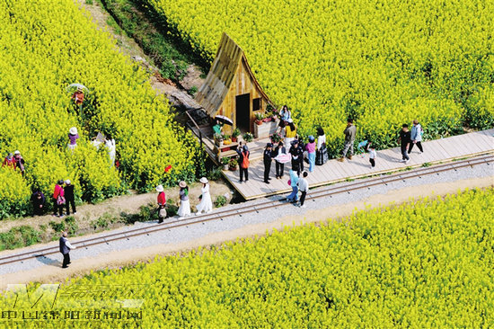 3月17日,涪城区杨家镇千亩油菜花海吸引众多游人前来观赏。 记者 刘晏男 摄